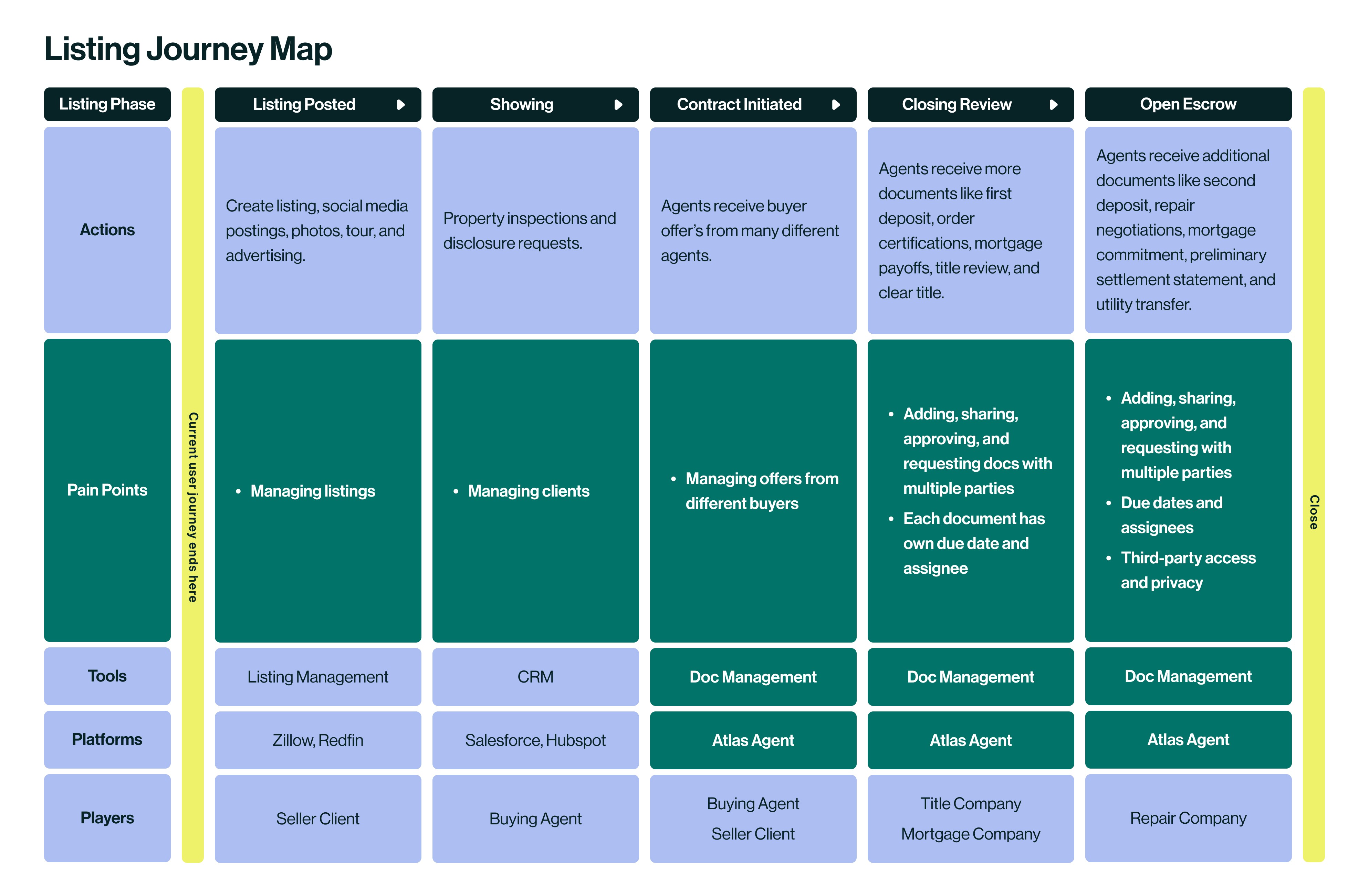 After interview agents, we needed to figure out where those pain points lay throughout the property listing transaction process. So I mapped out the lifespan of a listing to close and pointed out which points Atlas has the opportunity to address. We used this to inform design decisions as well as company alignment.