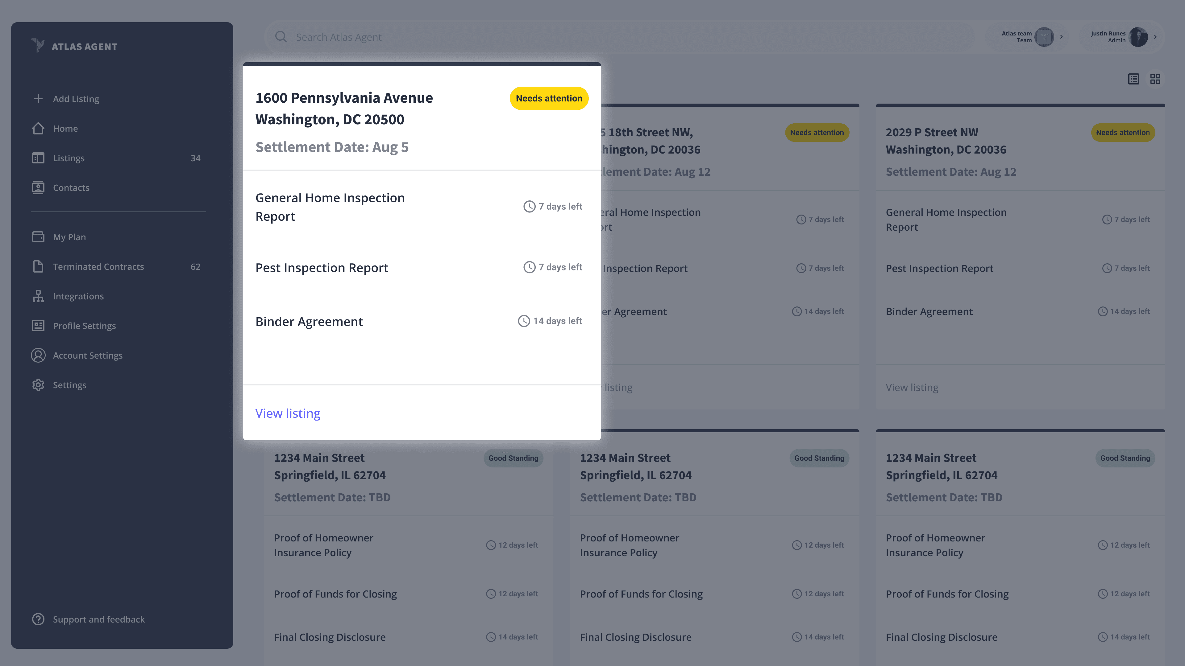 We want users to know where they are, so listing name goes first along with a "Needs Attention" tag and Settlement Date.
