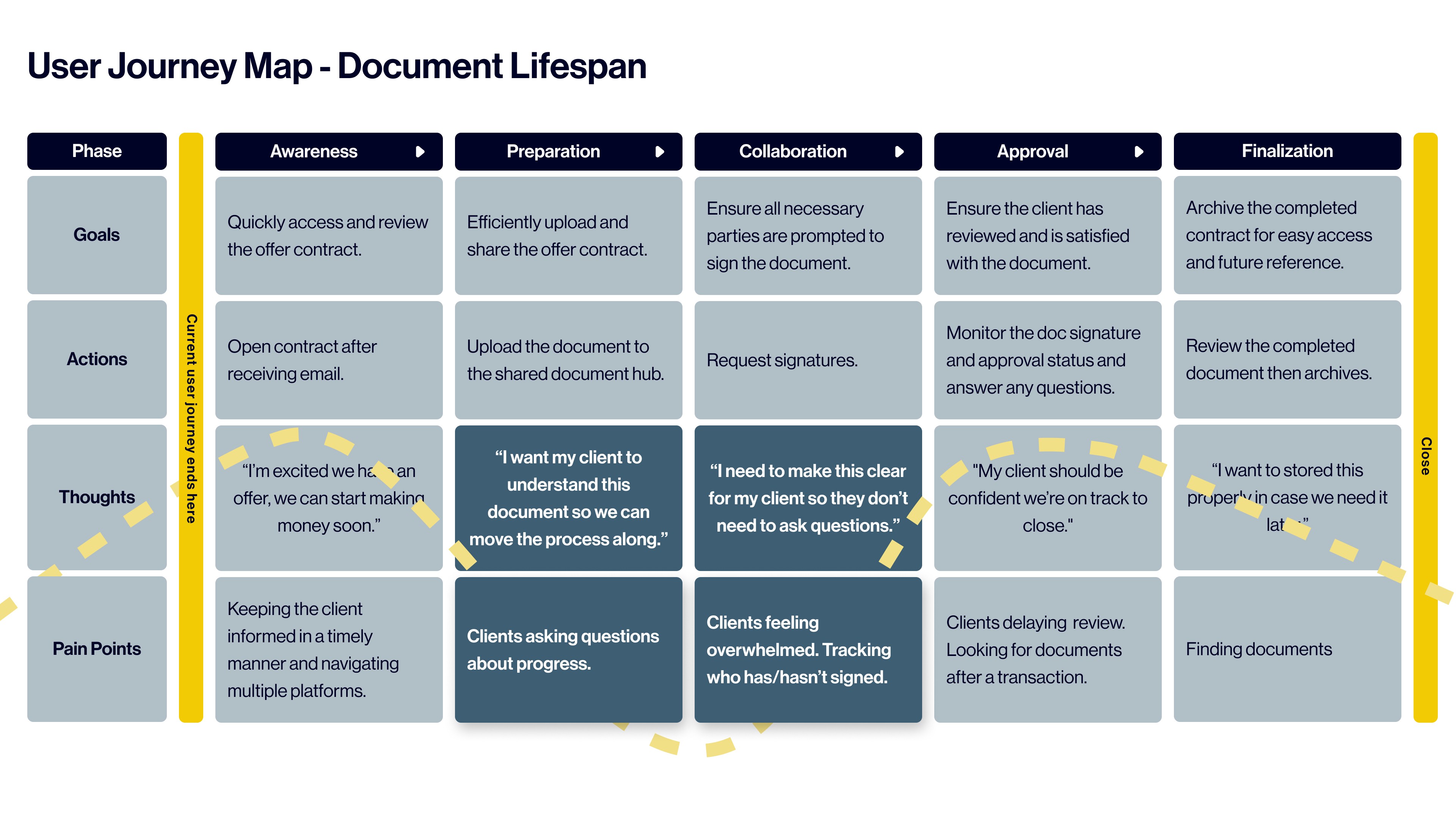 Client satisfaction is at the top of the list of priorities seller agents have. This user journey map finds the pain points agents experience in the document management process. With it, we can more narrowly decipher how our product can be the solution.